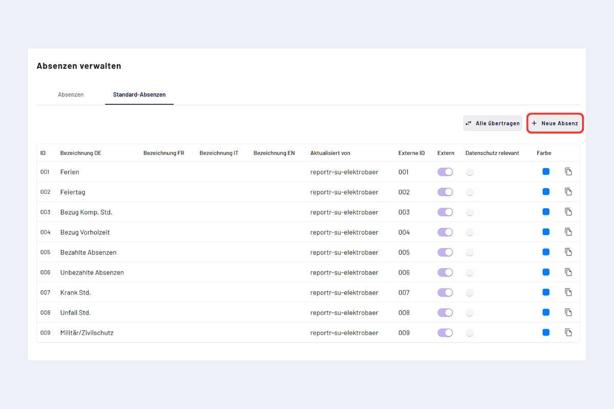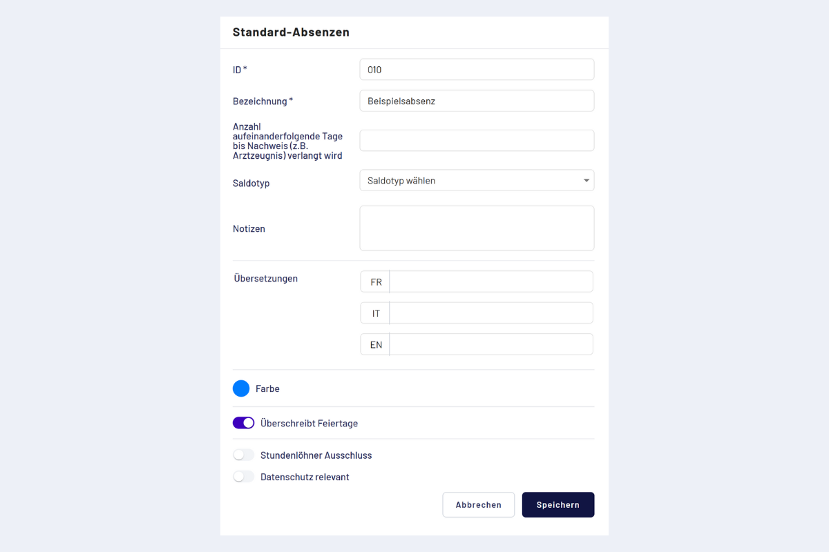 Erstellen Sie eine neue Standardabsenz im Register «Standardabsenzen».