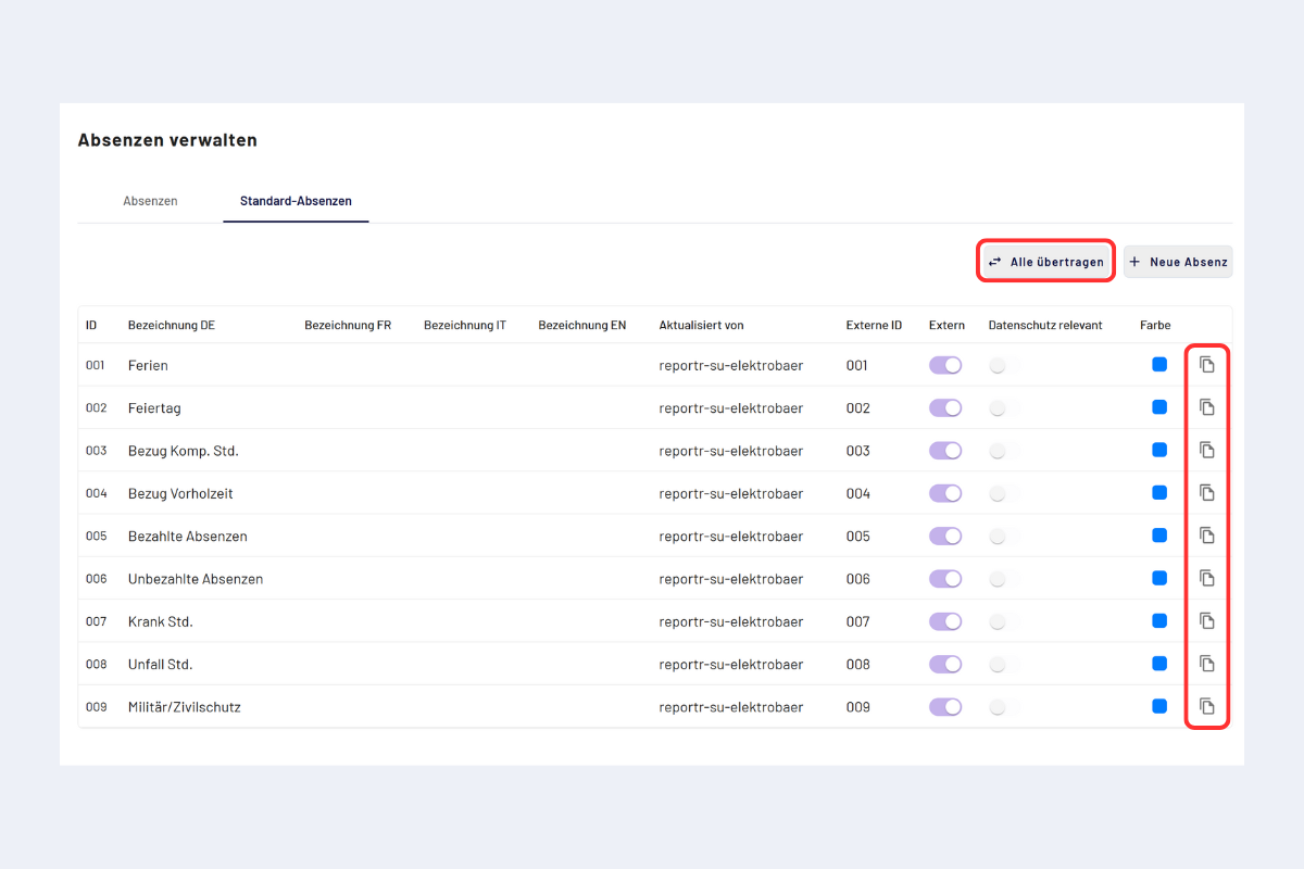 - Standardabsenzen: Für Firmen mit mehreren Gesellschaften – einmal zentral definieren und auf die gewünschten Gesellschaften übertragen/kopieren.