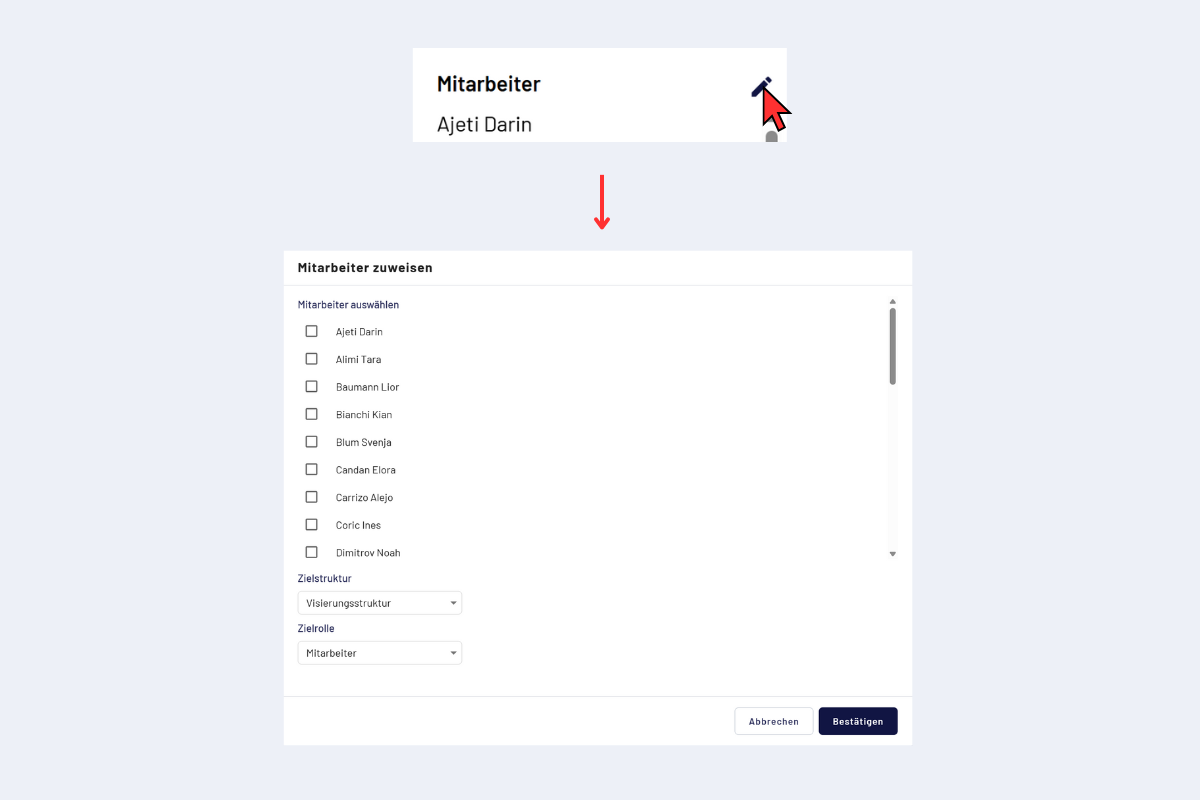 Wenn sehr viele Mitarbeitende verschoben werden müssen, ist der Weg über das Bearbeitungssymbol oft schneller: Klicke auf das Stift‑Icon, wähle Zielstruktur und Rolle, und markiere die Mitarbeitenden direkt in der Liste. So lassen sich mehrere Personen zügig der gewünschten Stufe zuordnen.