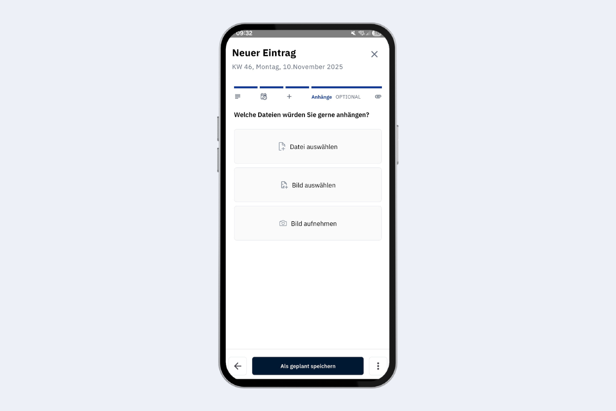 - Anhang: Optional Bilder oder Dokumente hinzufügen, bevor du speicherst oder weiterleitest.