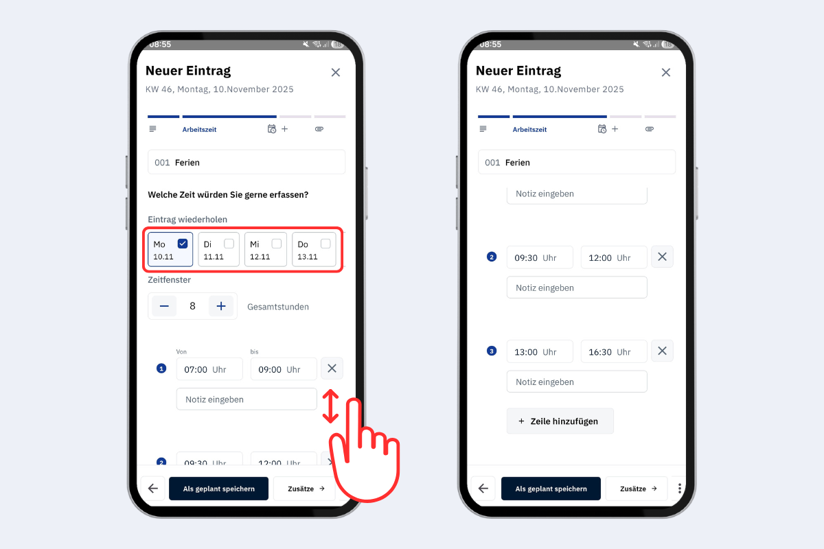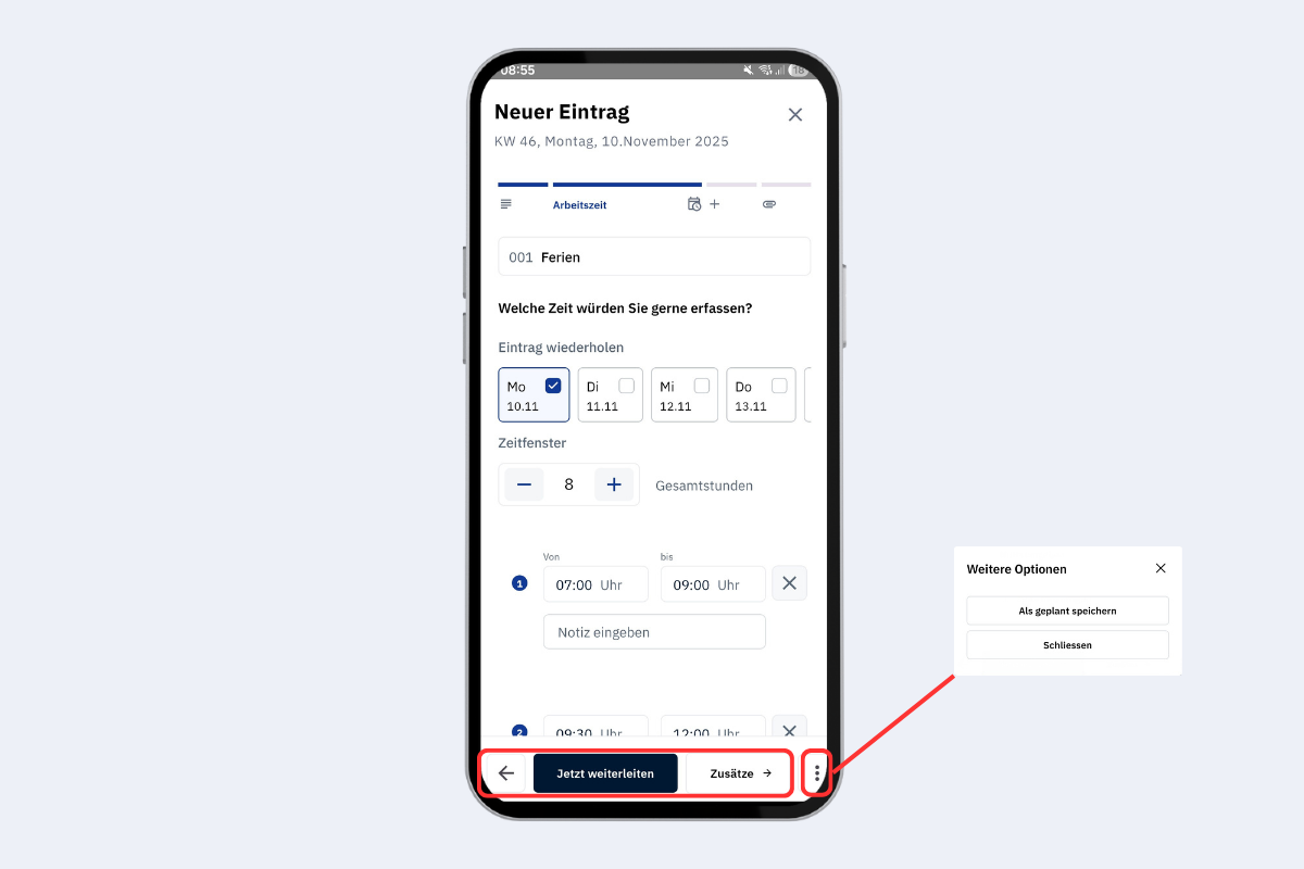 - Als geplant speichern: Eintrag wird als geplant gespeichert und kann weiterhin bearbeitet werden bis er weitergeleitet oder die Woche abgeschlossen wird.
