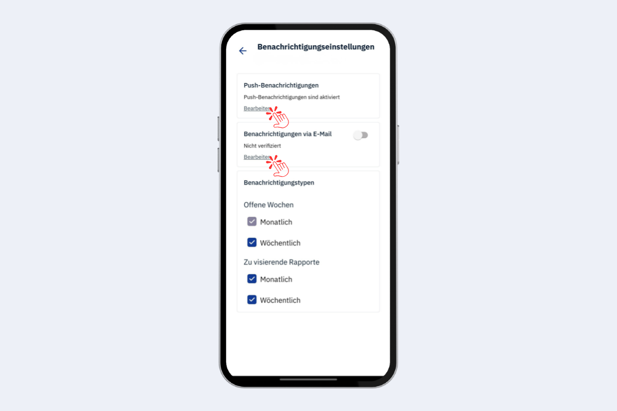 - Push: Bei «Bearbeiten» öffnest du die System‑Einstellungen deines Handys (Android oder iPhone), um Push zu erlauben.