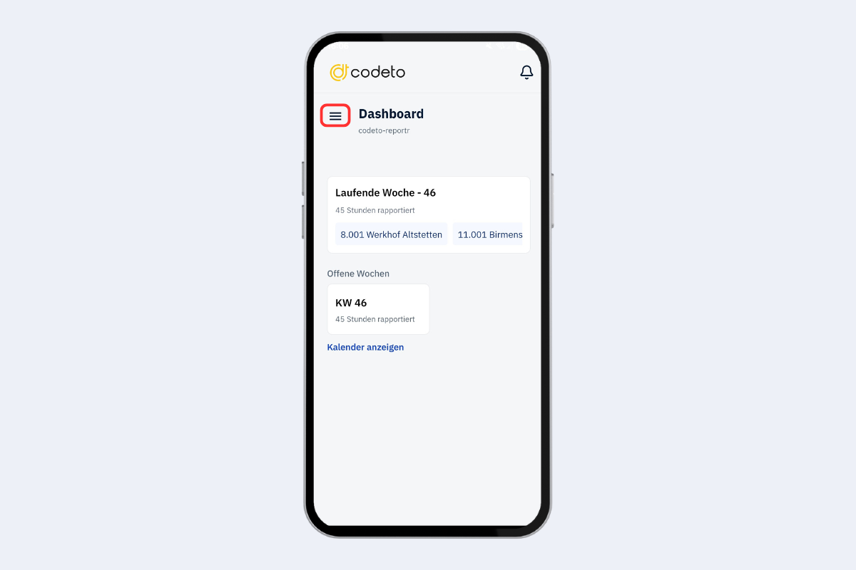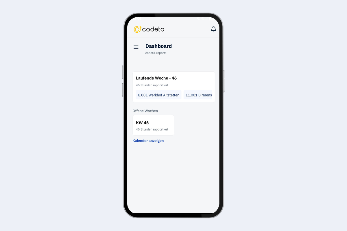 Du landest automatisch auf dem Dashboard. Hier siehst du die laufende Woche und offene Wochen, die du noch rapportieren und abschliessen musst. Oben rechts informiert das Glocken‑Icon über neue Benachrichtigungen. Mehr dazu im Kapitel Dashboard.