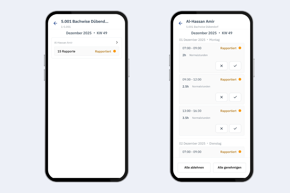 Dieses Kapitel richtet sich an Projektleitende (PL) und Vorgesetzte, die Rapporte in der Mobile App prüfen und visieren.