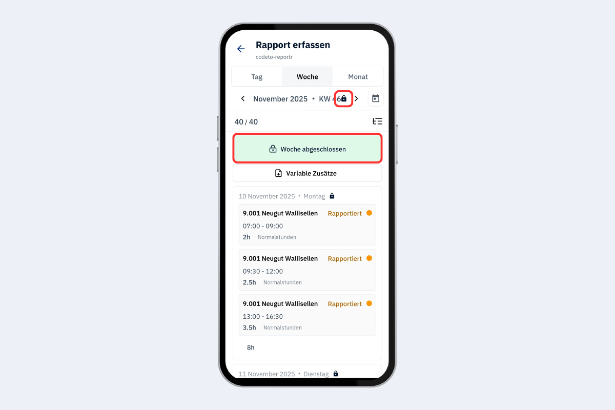 Nach der Bestätigung ist die Woche abgeschlossen. Die Woche ist grün hinterlegt und mit einem Schloss gekennzeichnet (im Bild rot markiert).