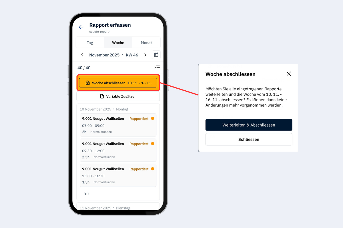 Schliesse deine Woche ab, wenn alle Einträge vollständig erfasst sind.