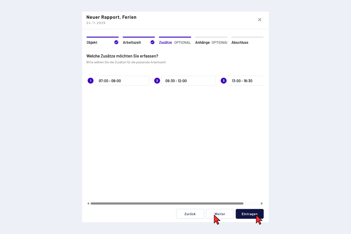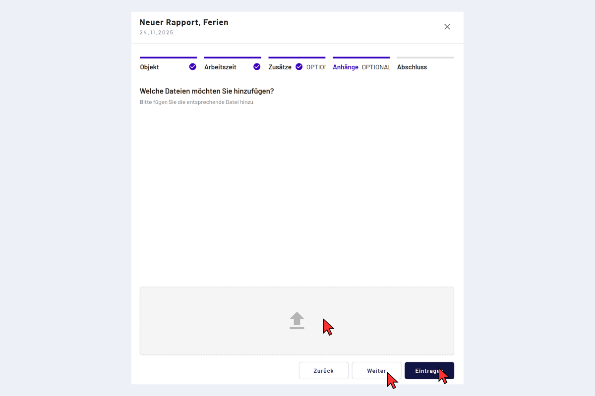 Im letzten Schritt kannst du den Rapport mit Anhängen ergänzen. Zulässige Formate sind Bildformate sowie PDF.