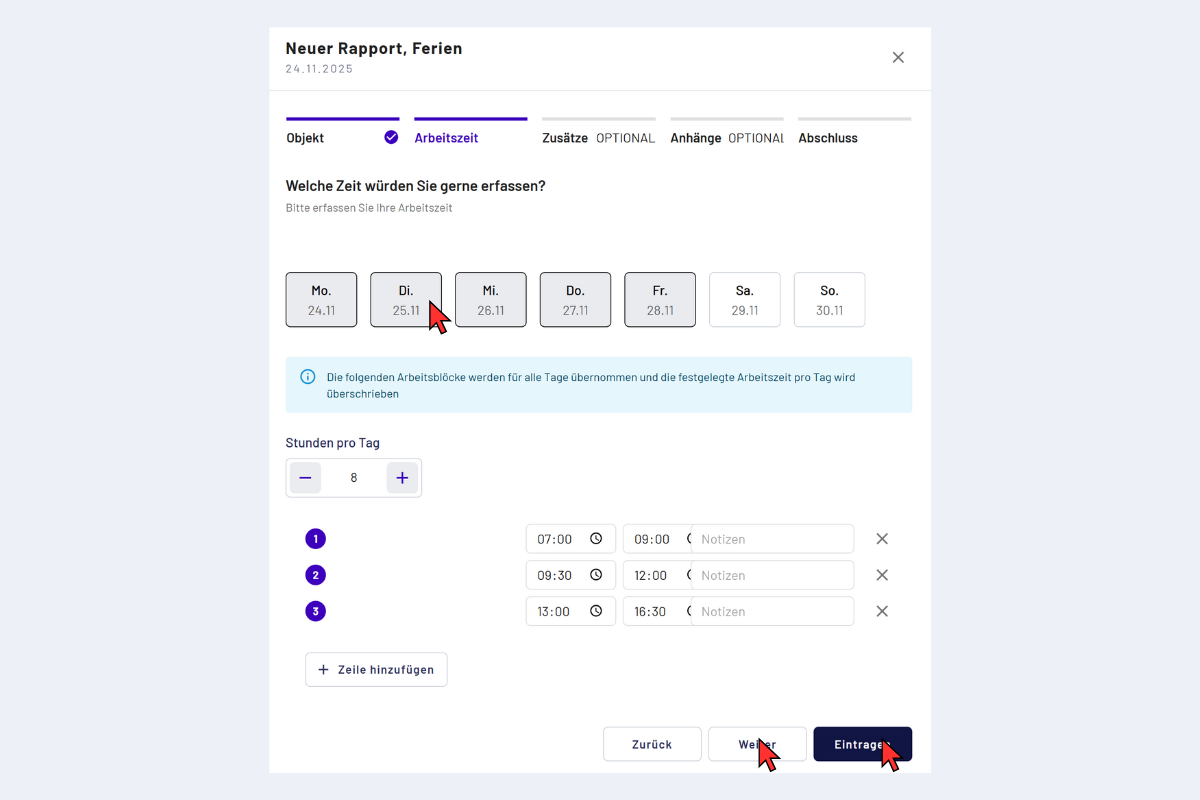 - Optional pro Zeitblock eine Notiz erfassen.