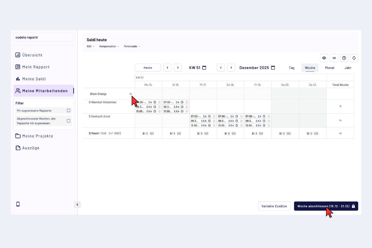 Als Admin kannst du für alle Mitarbeitenden Rapporte erfassen. Vorgehen wie gewohnt: