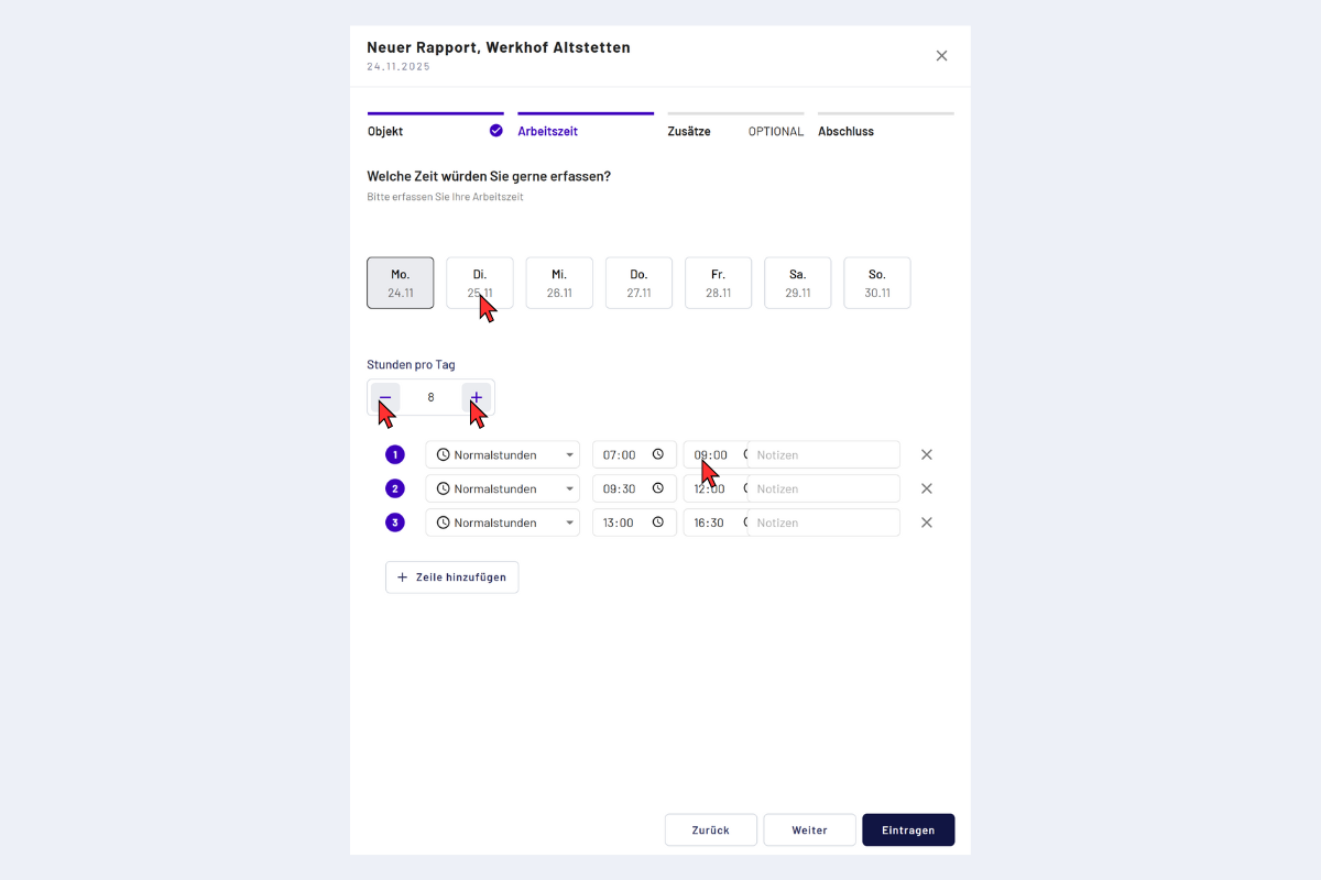 - Arbeitszeit eintragen (von–bis oder Dauer)
