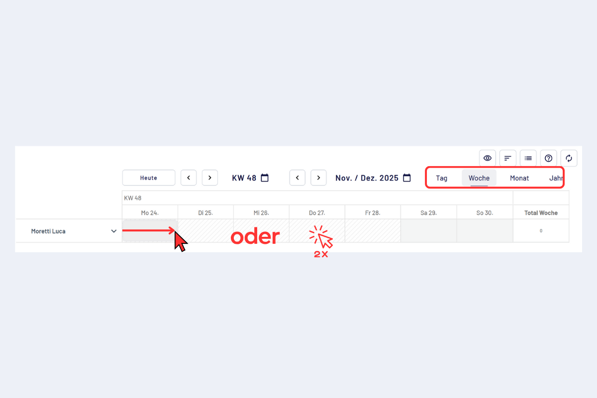 - Tagesansicht: Per Doppelklick oder Drag & Drop auf Stundenbasis
