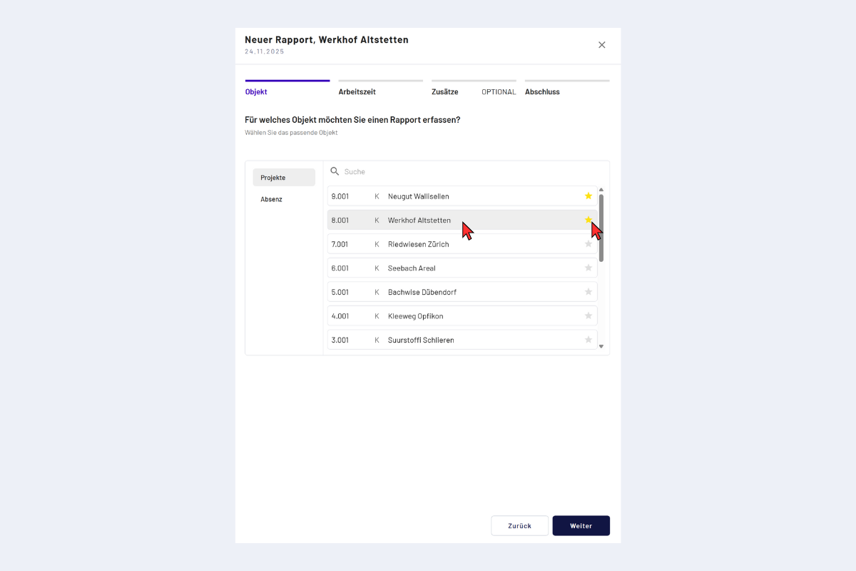 Projekte, die du häufig buchst, als Favorit markieren. So erscheinen sie bei zukünftigen Buchungen immer zuoberst und du sparst Zeit. Favoriten sind mitarbeiterbezogen. Wenn du als Admin oder Vorgesetzte für eine Person buchst und dort einen Favoriten setzt, sieht diese Person diesen Favoriten ebenfalls, wenn sie sich anmeldet.