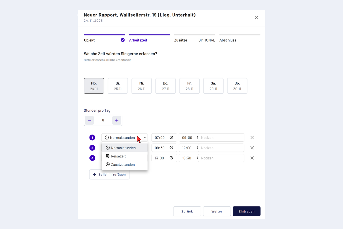 - Stundentypen: Wähle zwischen Normalstunden, Reisezeit und Zusatzstunden. Reisezeit und Zusatzstunden werden nicht zu den Sollstunden gezählt, sie werden separat ausgewiesen.
