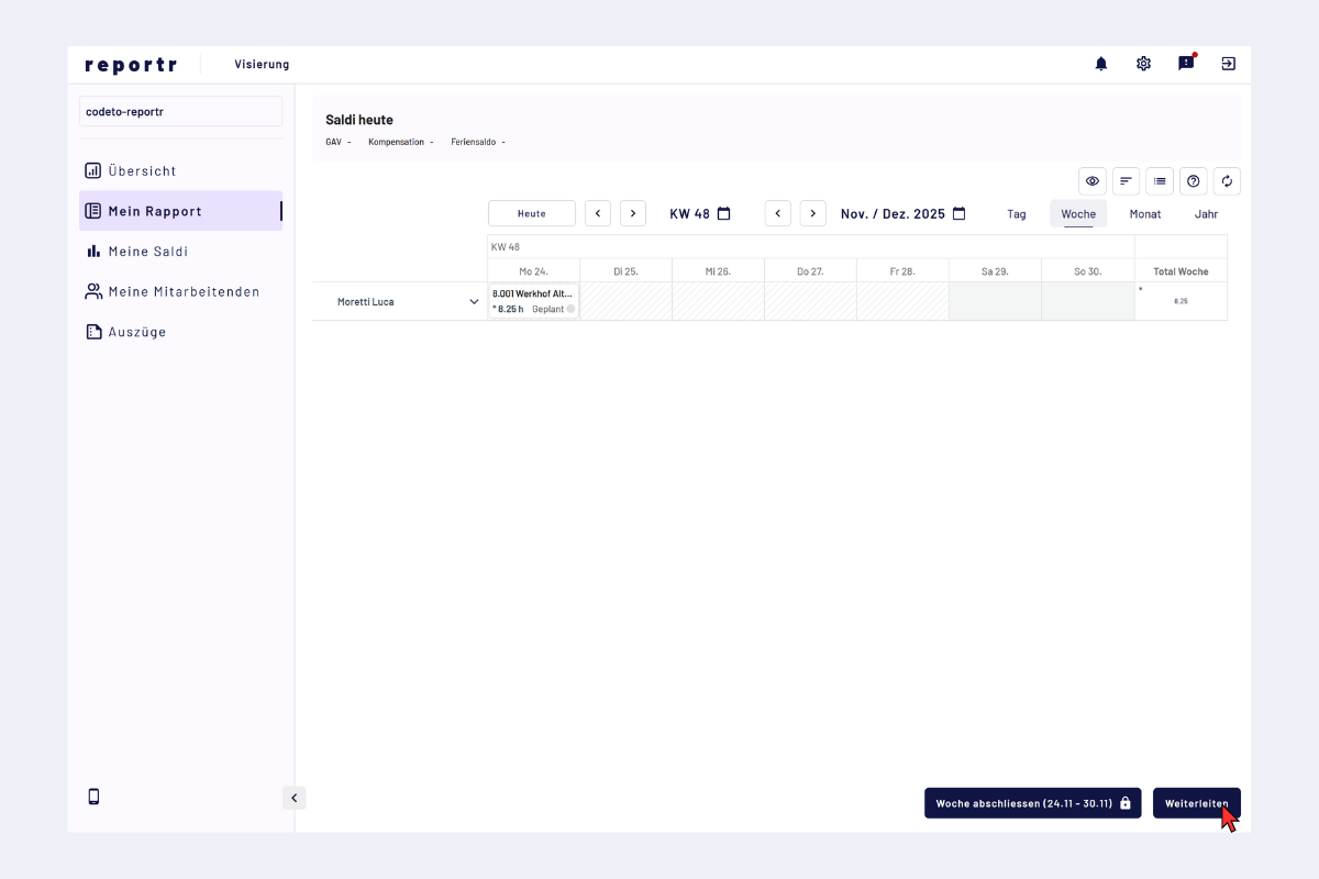 - Ausnahme: Wird der Rapport abgelehnt, kommt er zurück und kann erneut bearbeitet werden. Oder die vorgesetzte/ projektleitende Person öffnet die Woche nochmals, dann sind Anpassungen möglich.