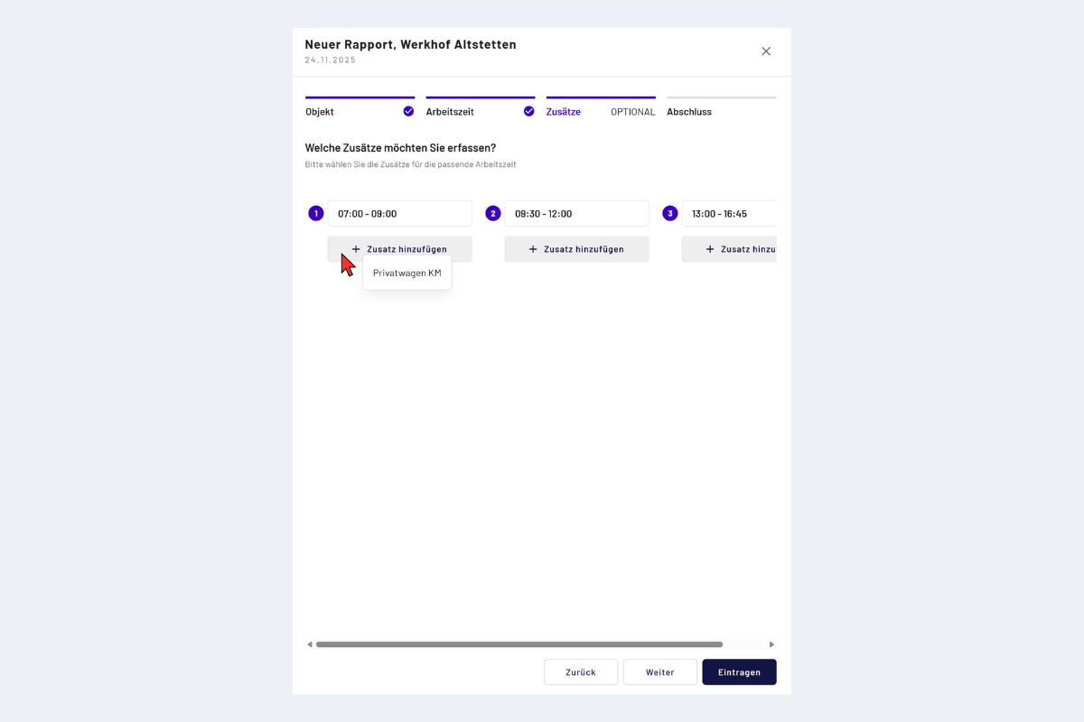 In diesem Schritt stehen die vom Admin vorkonfigurierten Zusätze in einem Dropdown zur Auswahl; eigene Zusätze können hier nicht erstellt werden. Beispiel: «Privatfahrzeug KM» (Eingabewert = gefahrene Kilometer). Der hinterlegte Satz berechnet automatisch den Frankenbetrag.