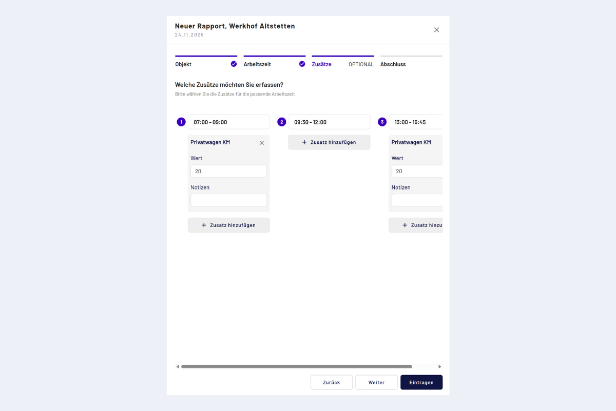 Nachdem Projekt und Zeit erfasst sind, kannst du im letzten Schritt «Zusätze» erfassen: