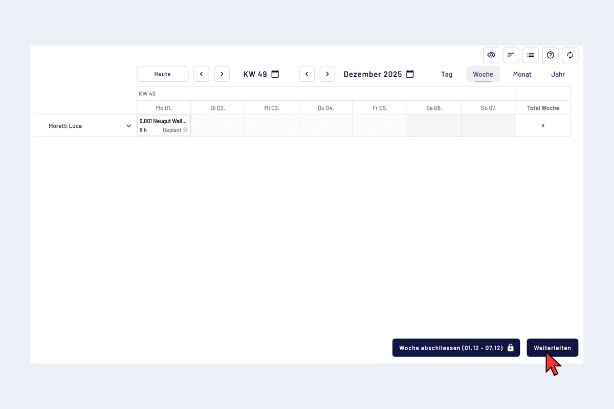 Hinweis zum Beispiel: In der Abbildung würde nur Montag, der 1. Dezember, weitergeleitet. Würdest du stattdessen die Woche abschliessen, erscheint ein Warnhinweis, dass für Dienstag bis Freitag keine Zeit erfasst wurde. Du kannst die Woche trotzdem durch Bestätigen abschliessen.
