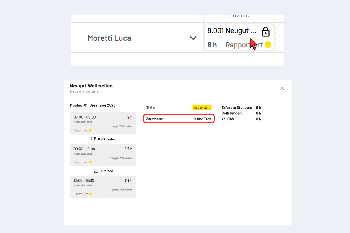 Ein weitergeleiteter Rapport erscheint gelb und mit Schloss. Beim Klick auf den Rapport öffnet sich ein Pop-up. Im Feld «Zugewiesen» sehen Sie, bei wem der Rapport aktuell liegt.
