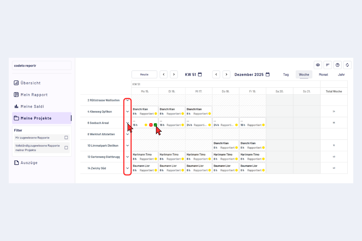 - Fokus auf Projekte: Pro Projekt alle Rapporte prüfen.