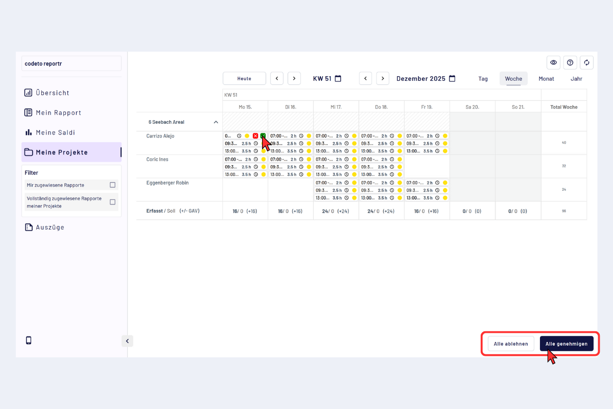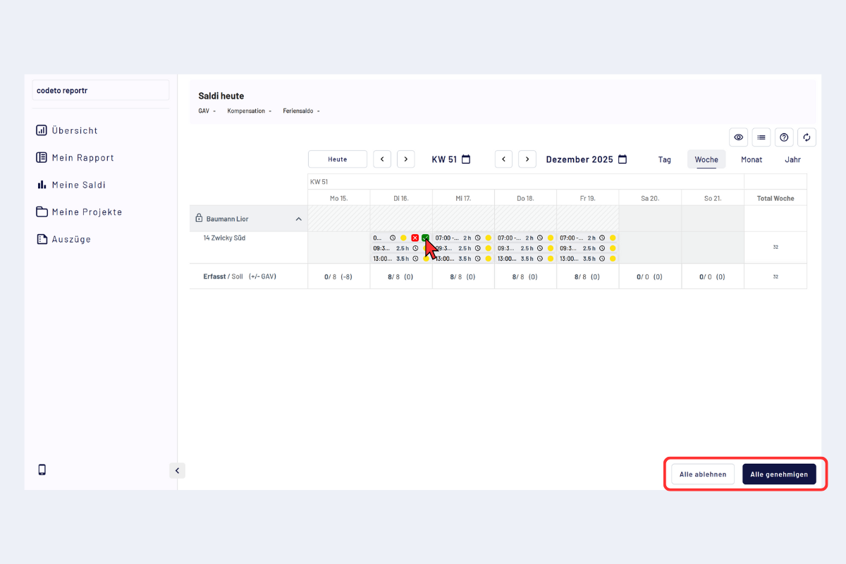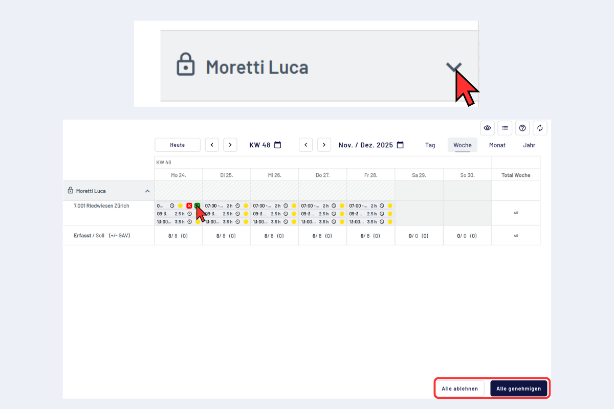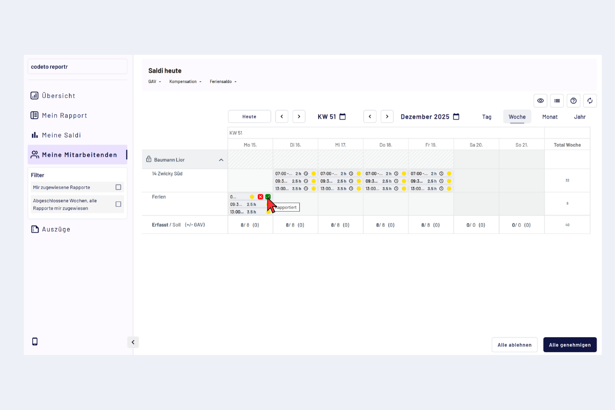 In der Detailansicht pro Mitarbeitendem kannst du für die gewählte Periode (Tag, Woche, Monat, Jahr) alle Rapporte auf einmal genehmigen oder ablehnen – oder alternativ einzelne Blöcke gezielt visieren/ablehnen.