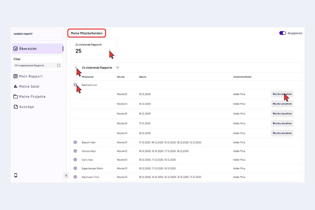 - Fokus auf einzelne Mitarbeitende: Alle Rapporte einer Woche im Kontext der Person prüfen.