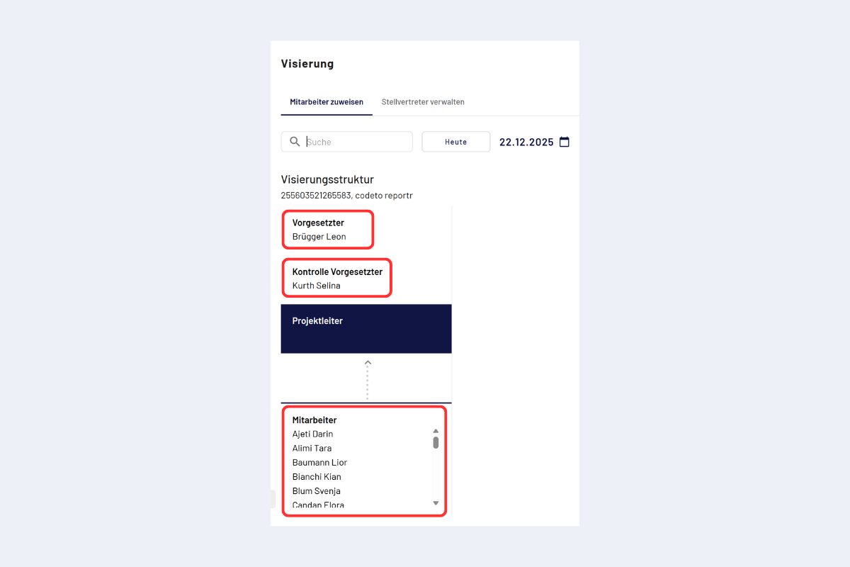 Beispiel: Im folgenden Bild erscheinen Leon Brügger und Selina Kurth – sie sind in der Visierungsstruktur unterhalb von mir eingereiht und werden deshalb in «Meine Mitarbeitenden» angezeigt. Alle Personen, die hier aufgelistet sind, erscheinen automatisch. Änderungen an dieser Liste sind nur mit Admin‑Berechtigung möglich.