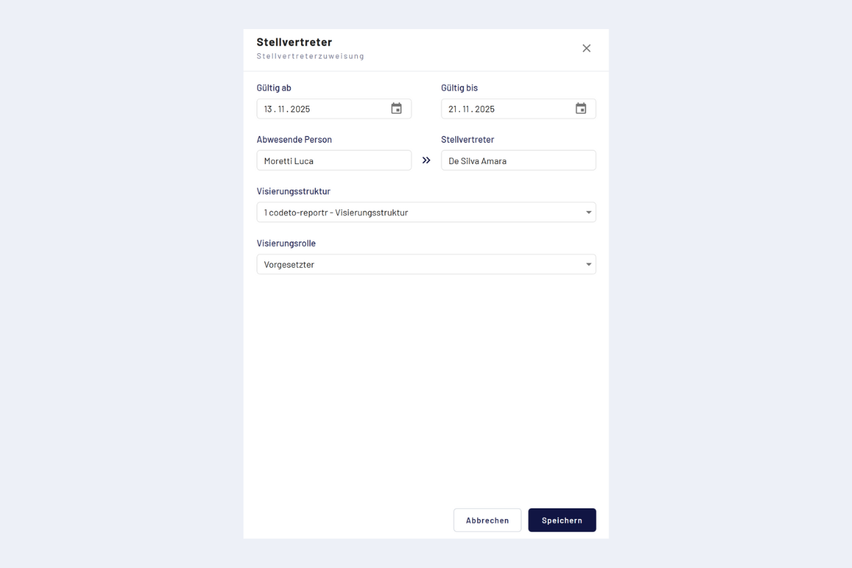 Nach dem Klick öffnet sich eine Eingabemaske. Dort wählst du die ersetzte Person, die Stellvertretung und den Zeitraum. Speichere die Eingabe, danach werden Rapporte im definierten Zeitraum automatisch an die Stellvertretung zugestellt. Aktionen der Stellvertretung erscheinen im Umlaufprotokoll.