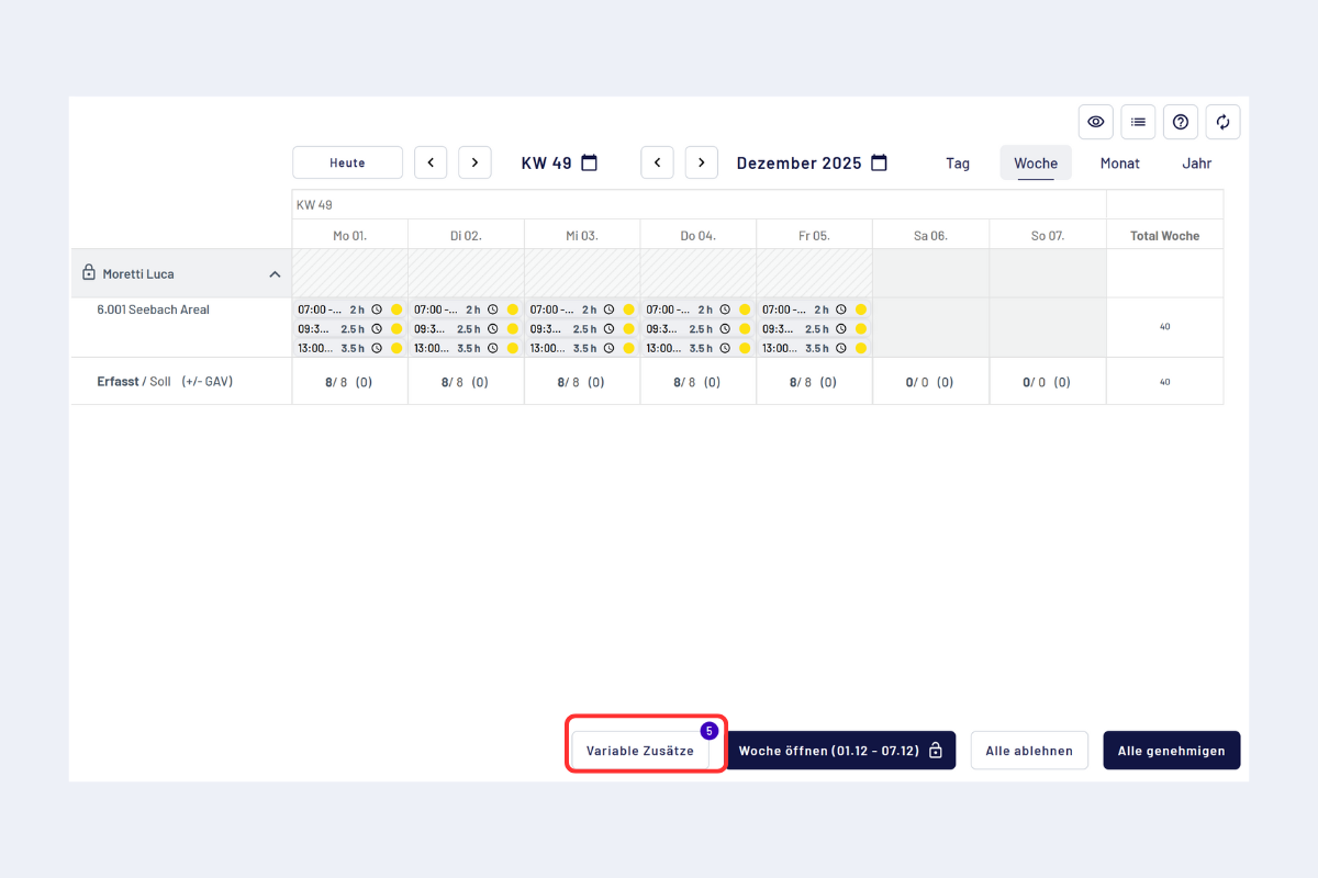 Unten siehst du den Hinweis «Variable Zusätze» mit einer Zahl. Diese Zahl zeigt, wie viele Variable Zusätze in dieser Woche automatisch gegriffen haben oder hinzugefügt wurden.