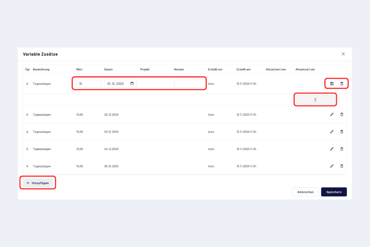 In diesem Kapitel prüfst du variable Zusätze (mitarbeiterbezogen) und fügst sie bei Bedarf hinzu. Variable Zusätze sind nicht an ein Projekt gebunden, sondern am Mitarbeitenden-Vertrag hinterlegt.