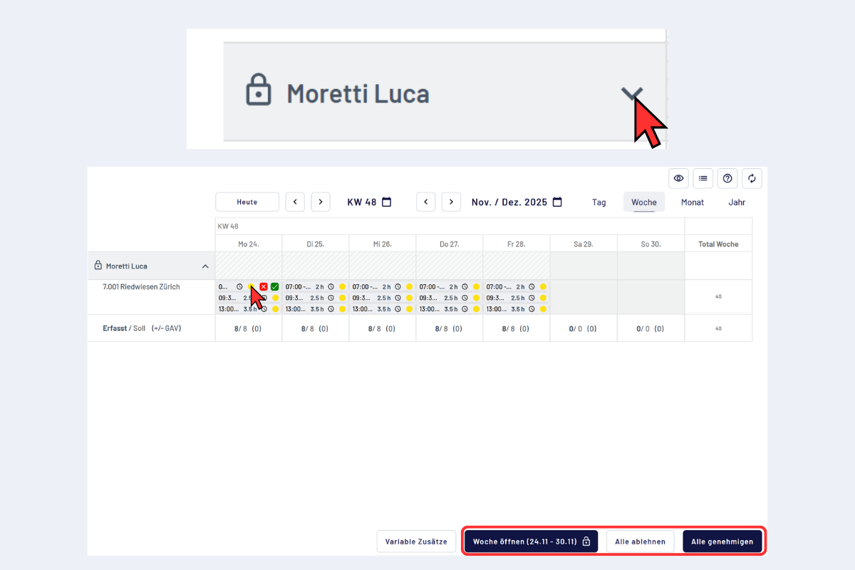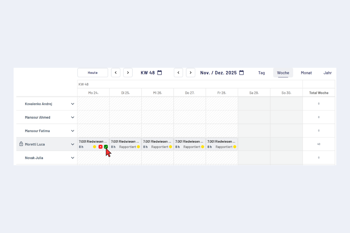 - Fahre mit der Maus über einzelne Rapporte. Es erscheinen ein grünes Häkchen (visieren) und ein rotes Kreuz (ablehnen). Die Aktion bezieht sich immer auf den ganzen Tag. Auch wenn der Tag aus mehreren Blöcken besteht (wegen Pausen), visierst oder lehnst du damit alle Blöcke dieses Tages gemeinsam ab bzw. genehmigst sie.