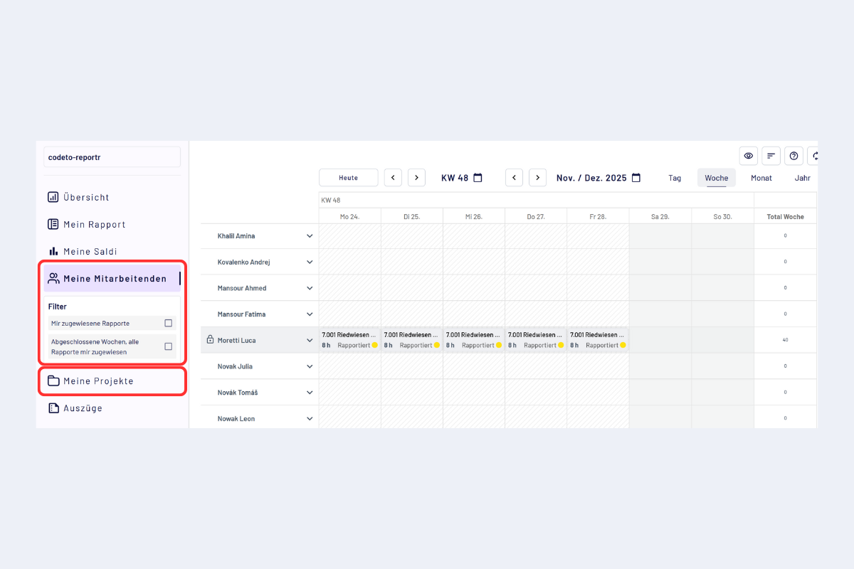 Für Projektleitende gilt: In «Meine Projekte» sind nur projektbezogene Rapporte sichtbar, und nur zu Projekten, bei denen du als Projektleiter hinterlegt bist. Wenn Mitarbeitende Zeit auf einem deiner Projekte rapportieren, erscheinen diese Rapporte hier. Erfassen Mitarbeitende eine Absenz, erscheint diese nicht in «Meine Projekte», sondern bei deren Vorgesetzten. Bist du gleichzeitig auch Vorgesetzter, siehst du diese Einträge zusätzlich in «Meine Mitarbeitenden».