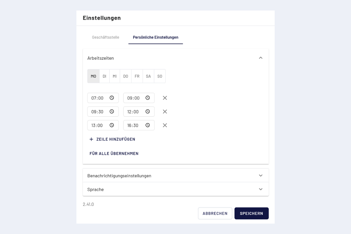 Mit «Für alle übernehmen» werden die Einstellungen auf alle Tage übernommen – inkl. Samstag und Sonntag