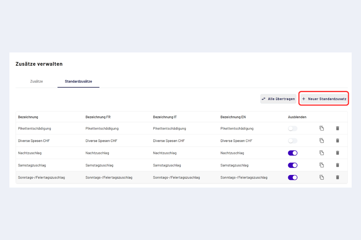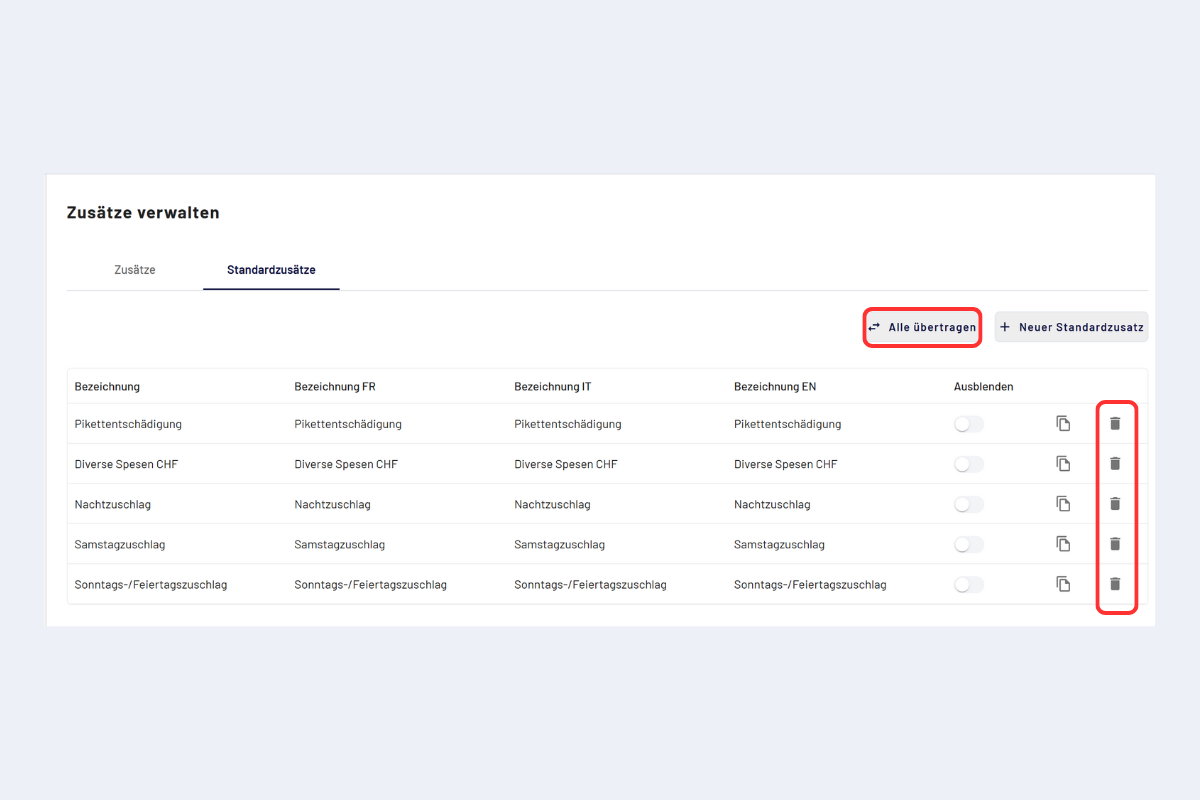 - Öffnen Sie «Standardzusätze» in den Einstellungen der Geschäftsstelle.