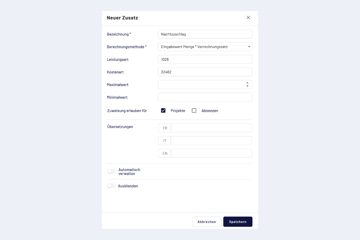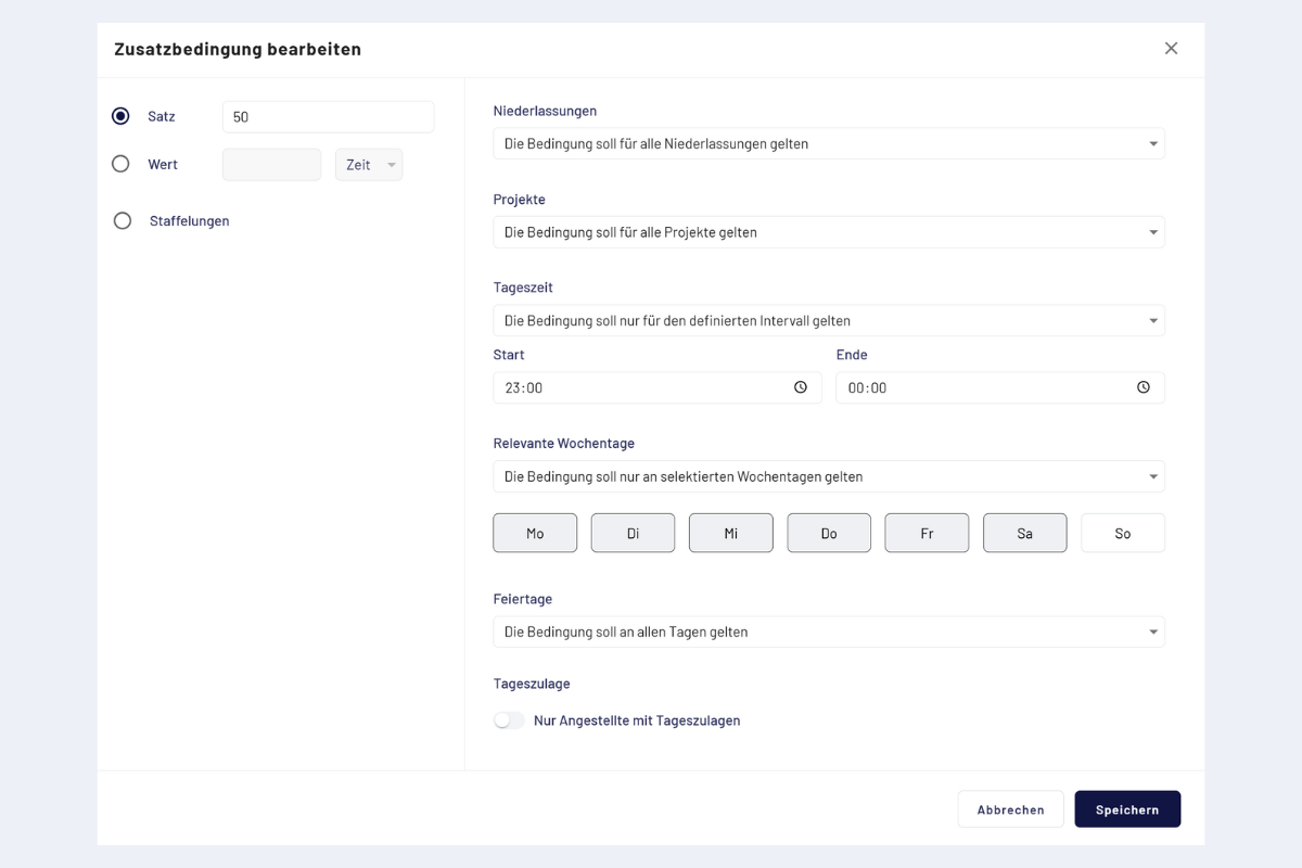 - Tageszeit: Zeitfenster festlegen (z. B. für Nachtzuschläge).