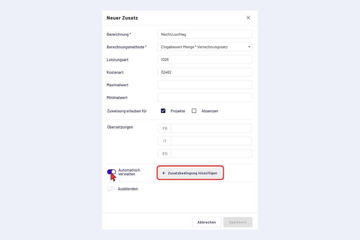 Hier definierst du Regeln, wann ein Zusatz automatisch hinzugefügt wird (z. B. abhängig von Zeit, Projekt oder Bedingungen).